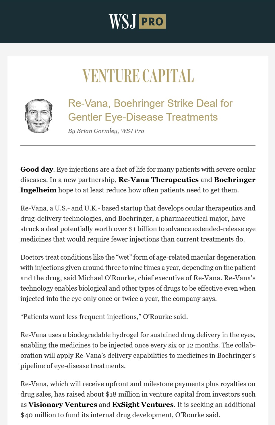 “The strategic collaboration with Boehringer Ingelheim marks a transformational moment for Re-Vana,” said Michael O’Rourke, Re-Vana Chief Executive Officer. “By combining our extended-release platform with Boehringer Ingelheim’s world-class research and development capabilities and eye health pipeline, we strive to bring forward a new generation of long-acting treatments for eye diseases that offer clinical and quality-of-life benefits for patients.”